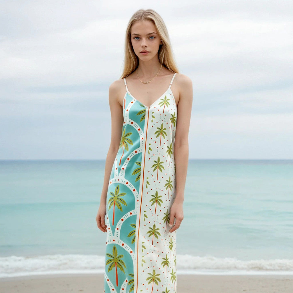 Puristische Eleganz trifft auf verspielten Charme. Das Design besticht durch seine schlichte Raffinesse. Die filigranen Spaghettiträger und der sanfte V-Ausschnitt betonen deine Weiblichkeit auf eine ganz natürliche, unangestrengte Weise. Das Besondere: Ein dezentes Spiel aus zwei verschiedenen, sommerlichen Mustern verleiht dem Kleid eine spannende Tiefe, ohne seine Leichtigkeit zu verlieren. Es ist ein modisches Statement für Frauen, die das Spiel mit Kontrasten lieben.